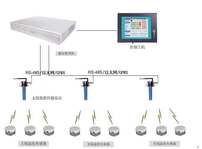 該系統(tǒng)由無線溫度傳感器、無線數(shù)據(jù)傳輸基站(或終端測(cè)溫儀)、管理中心組成。無線溫度傳感器安裝在被測(cè)設(shè)備表面,實(shí)時(shí)測(cè)量并無線發(fā)送溫度數(shù)據(jù);無線數(shù)據(jù)傳輸基站負(fù)責(zé)收集無線溫度信息,并通過RS-485、以太網(wǎng)、GPRS等方式傳輸?shù)焦芾碇行?;管理中心分析判斷溫度?shù)據(jù),給予溫升報(bào)警和設(shè)備隱患分析,提醒管理人員進(jìn)行處理。